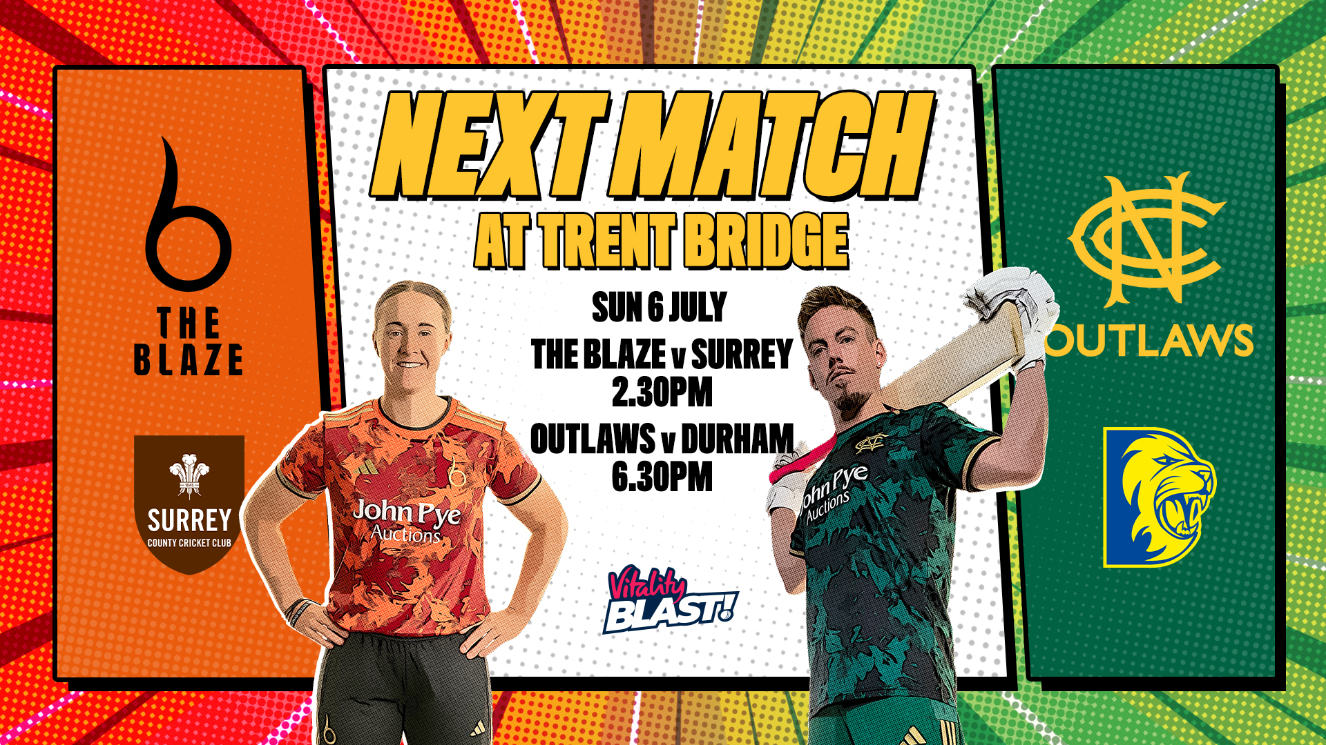 The Outlaws' quest for a quarter-final spot continues against Durham on Friday 11 July (6.30pm), with The Blaze facing Surrey from 2.30pm.