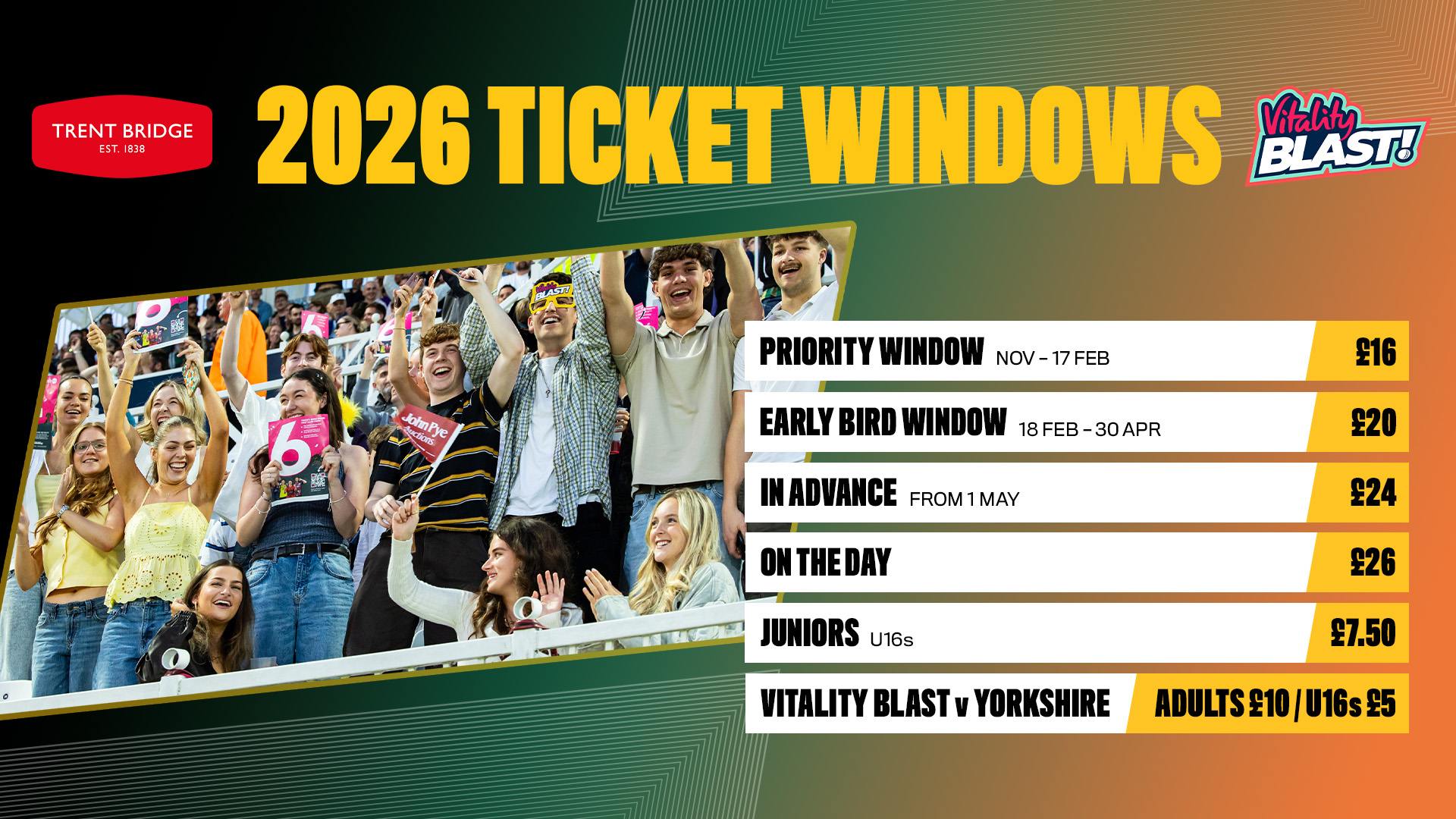 - All adult tickets being available for £16 for the remaining five Blast double-header matchdays