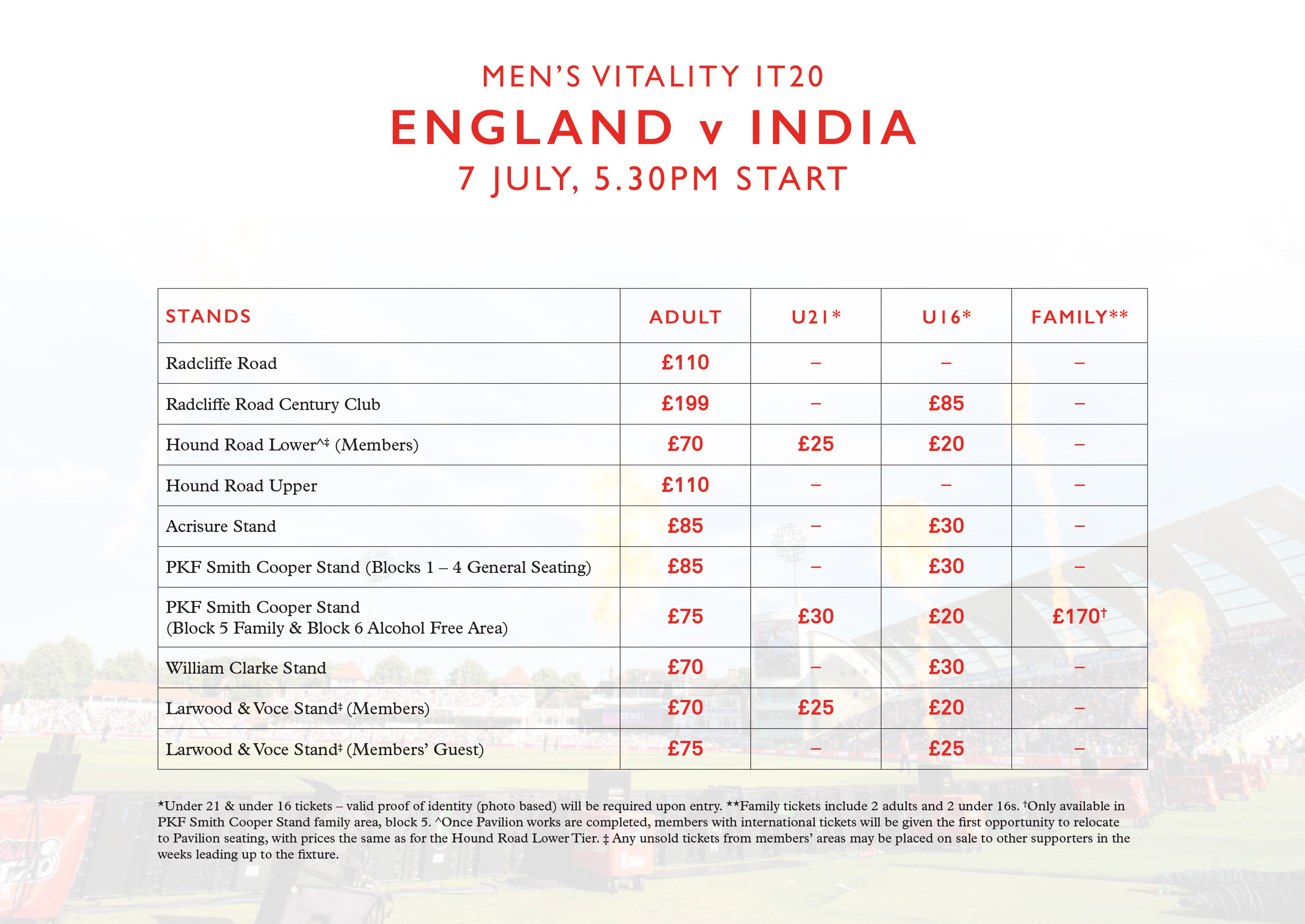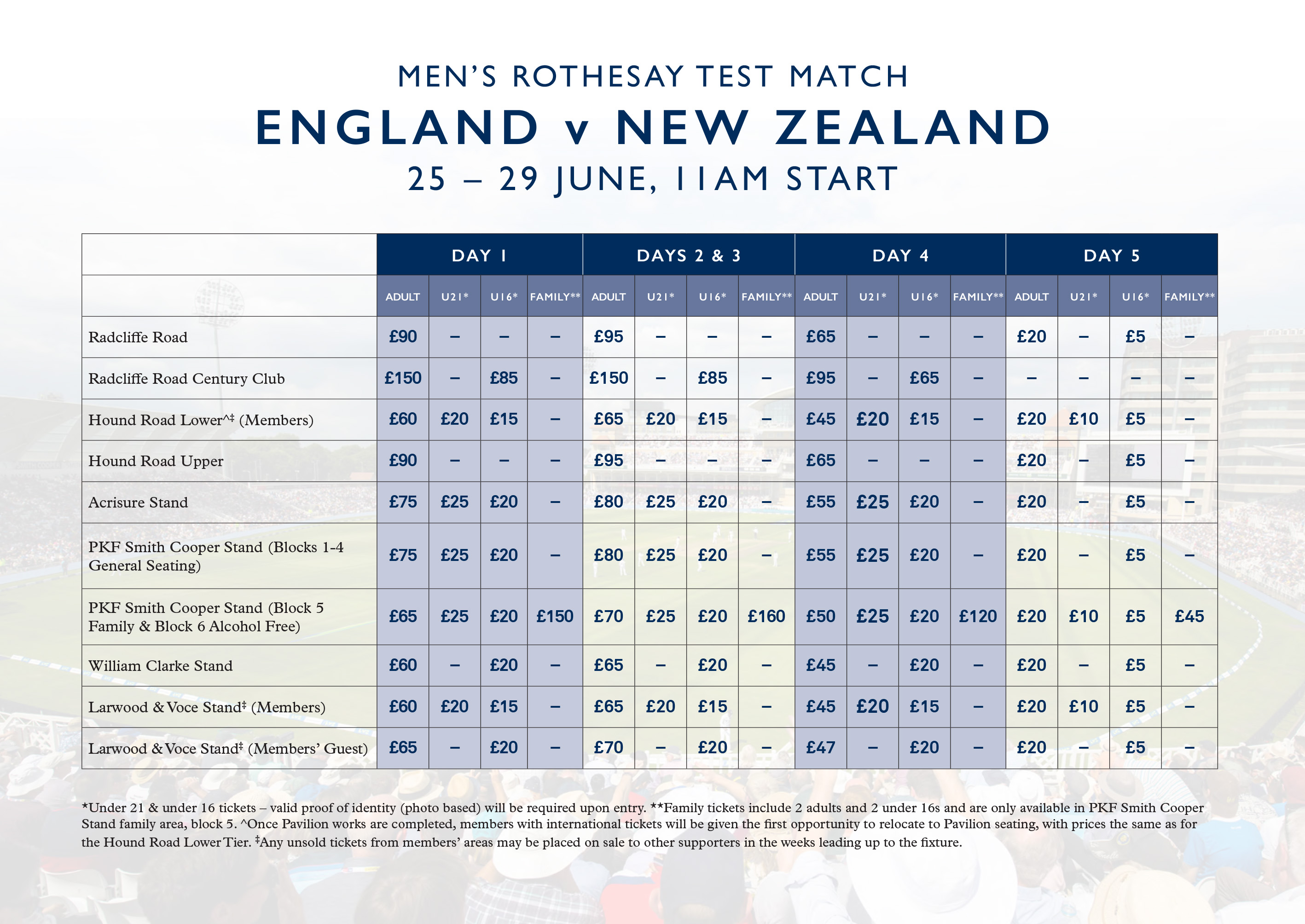 Prices for England's trips to Trent Bridge, meanwhile, were confirmed last week: