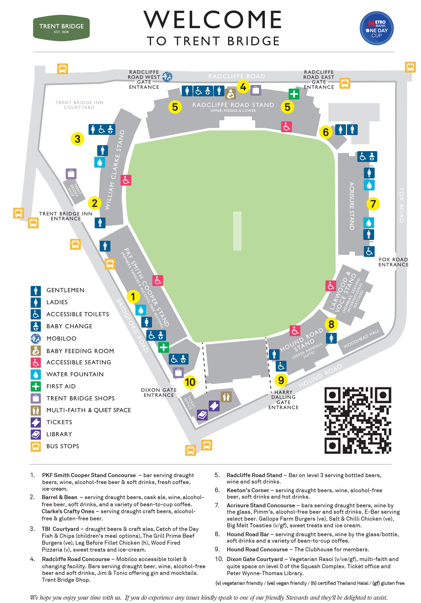 Free Wi-Fi is available throughout Trent Bridge, which you are very welcome to use at your leisure.