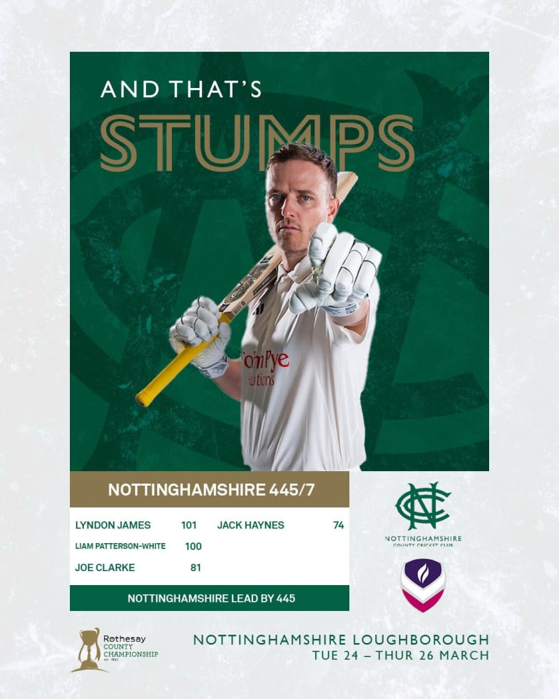 • Liam Patterson-White and Lyndon James hit centuries and retire, with fifties for Joe Clarke and Jack Haynes as Nottinghamshire surpass 400