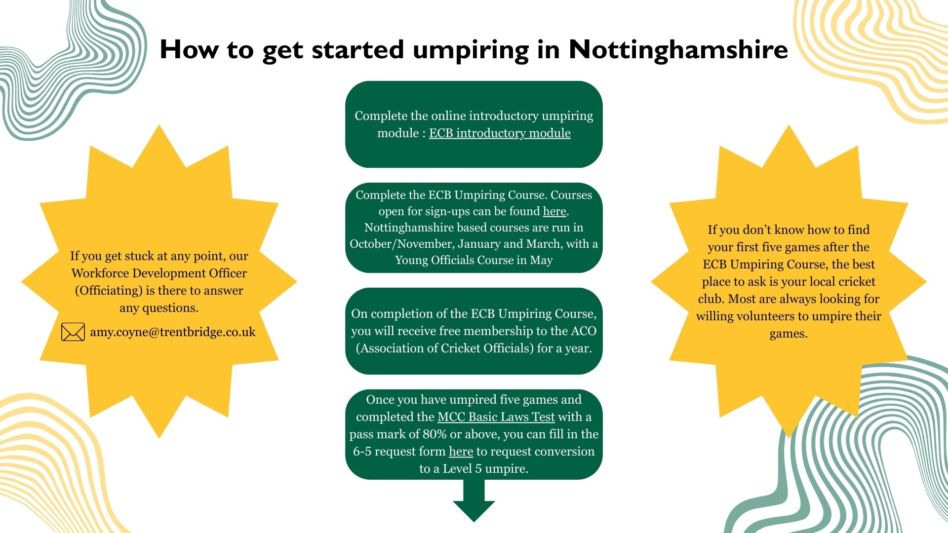 If you are already a trained umpire and would like to supplement the panel of willing volunteers who support cricket in the County, please contact amy.coyne@trentbridge.co.uk.