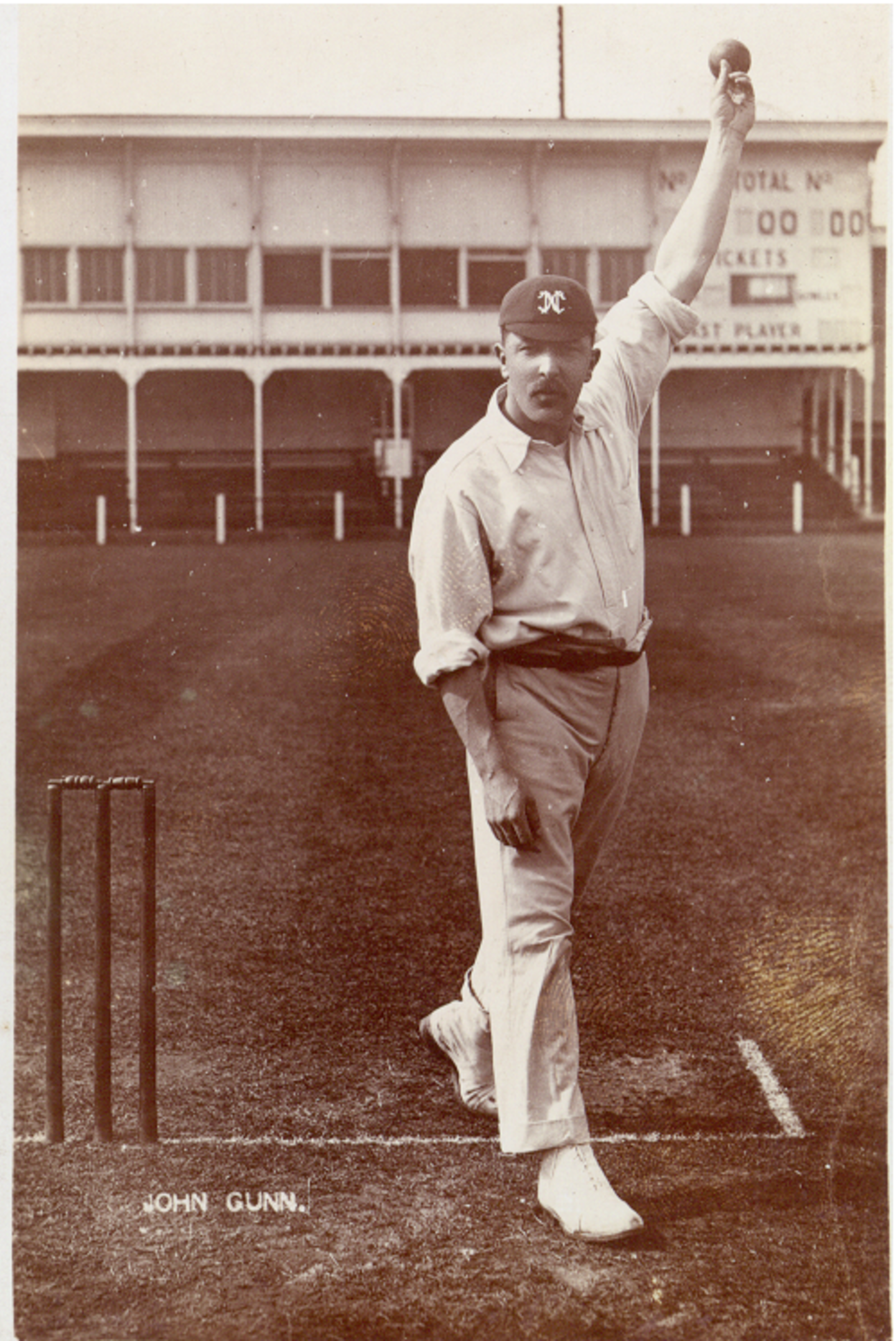 Born in Hucknall Torkard on 19 July 1876, John Gunn, brother of George and nephew of William, moved to Nottingham as a boy and played cricket for the Nottingham Castle CC and Radford & Cutts CC. He appeared in the Nottinghamshire Colts XXII of April 1896 and was distinctly useful with the ball, returning figures of 6-2-4-3.